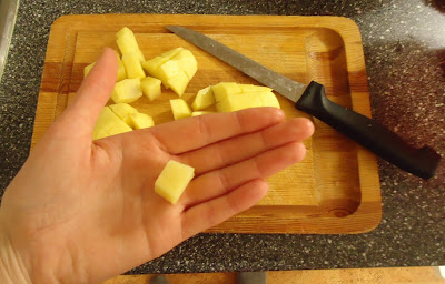 2. Peel potatoes, wash and cut them in small cubes (approximately 1 cm x1 cm). It's better to chop them small, so they get cooked faster and it will be easier to mash them afterwards. Dump potatoes and knorr cubes (or chicken brother) into the pan. If you add knorr cubes then add 8dl of water into the pan and let them get cooked for 15-20 minutes until potatoes are quite soft. Meanwhile add salt and pepper into the pan. I add salt in the beginning, because if we add it at the end, food will become salty and not quite tasty :)
